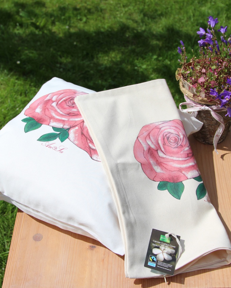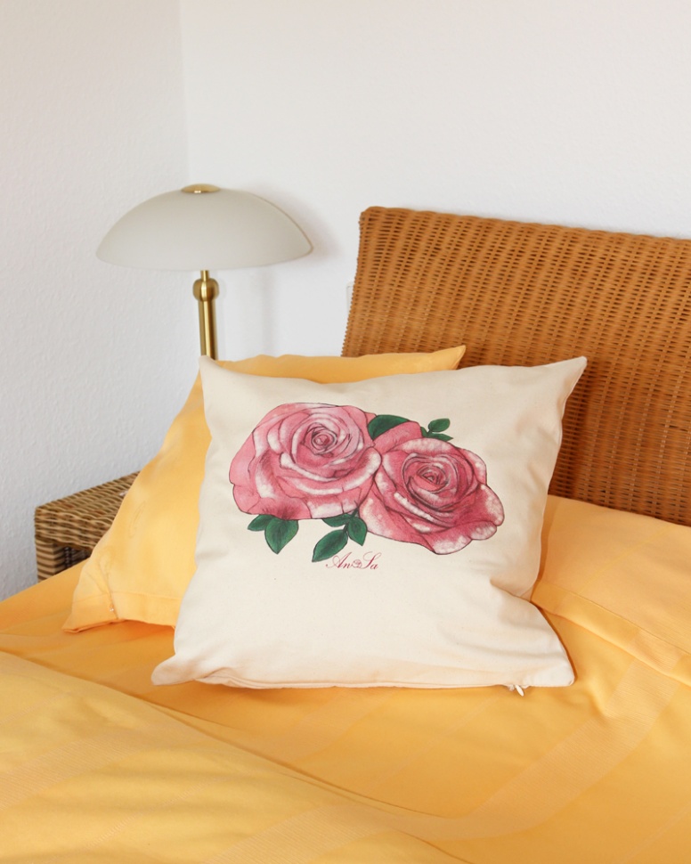Fein verarbeiteter Kissenbezug aus reinen Naturmaterialien liebevoll mit energetischem Rosenmotiv in einer Manufaktur in Österreich/Tirol bedruckt, passend zum Tiroler Zirbenkissen.
